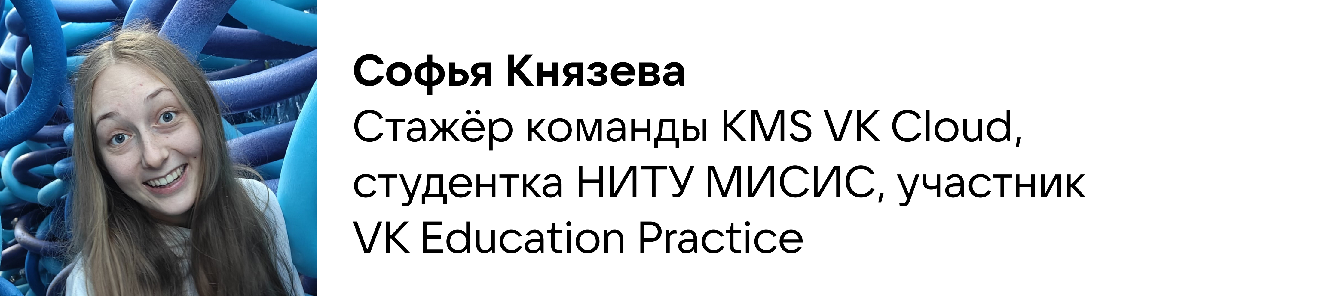 Когда появилась вакансия стажёра по Go-разработке, Софья откликнулась на неё, указав, что она один из лучших студентов практики. После HR-скрининга, базового и технического собеседования с будущим руководителем Софья получила офер в команду KMS VK Cloud.