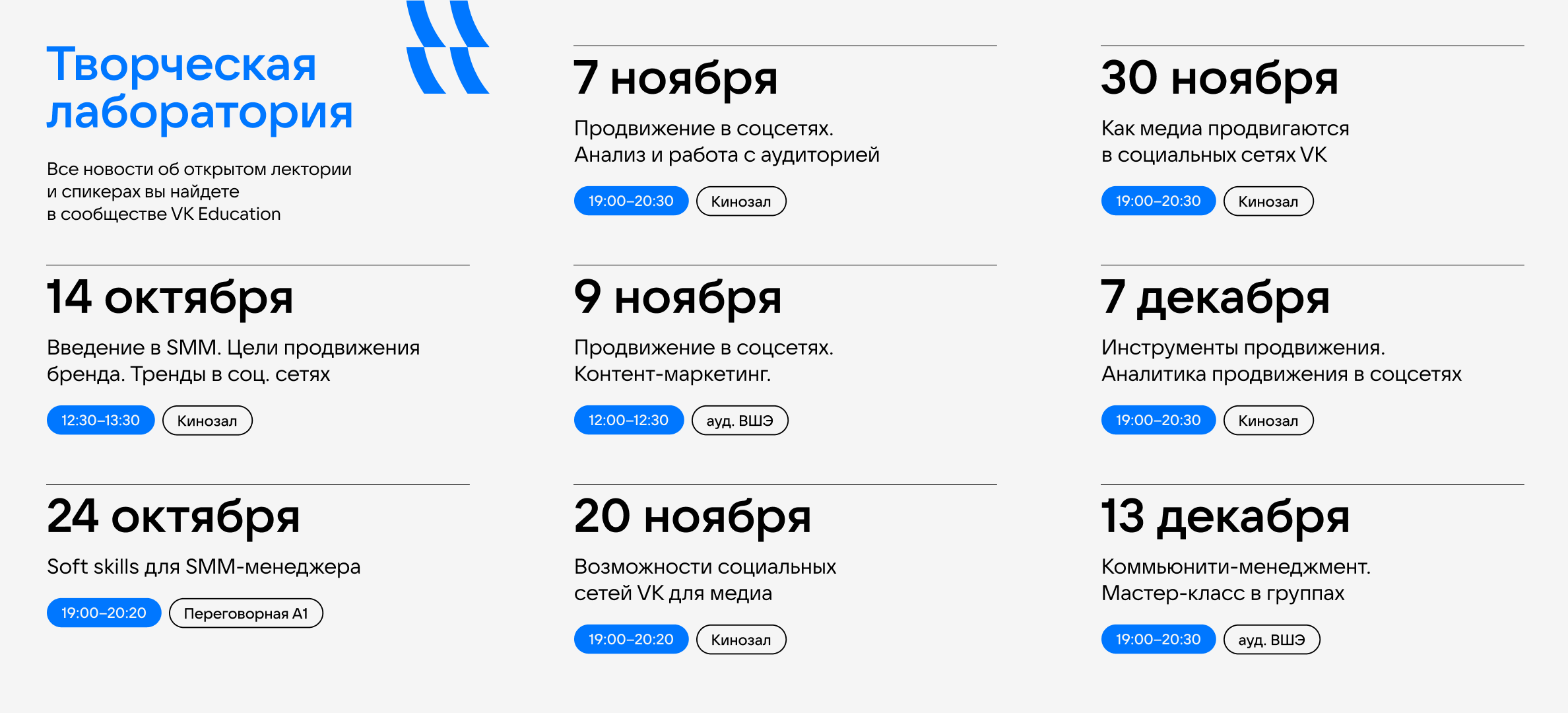 Следите за новостями в нашем сообществе ВКонтакте — именно здесь будут доступны анонсы предстоящих лекций. Начинаем с 14 октября.